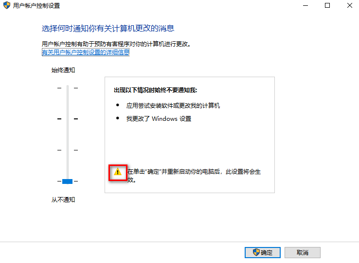 在控制面板 -> 查看方式:大图标 -> 用户帐户 -> 更改用户帐户控制设置 ->随便拖动一下确认,然后再拖到最下面,确定->重启电脑(没有三角型感叹号)->重启电脑后再看这个位置没有感叹号就可以了。